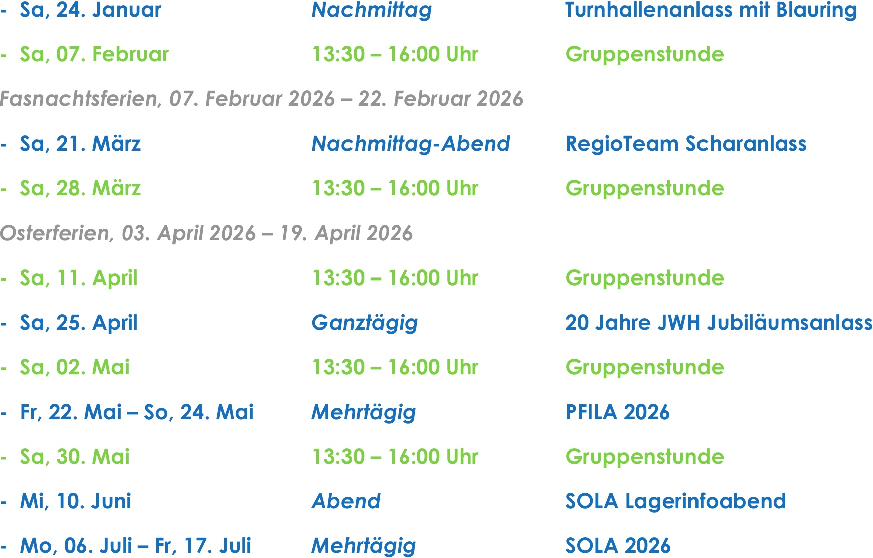 Die Gruppenstundenzeiten sind grundsätzlich einheitlich und dauern für alle Gruppen von 13.30 bis 16.00 Uhr. Wir treffen uns jeweils beim Jubla-Huus.
